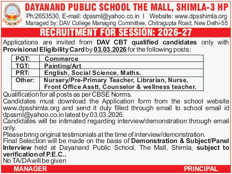 DAYANAND PUBLIC SCHOOL THE MALL SHIMLA, Himachal Pradesh - 171003 Phone : 0177 - 2653530 E-Mail : [email protected] Website: dpsshimla.org